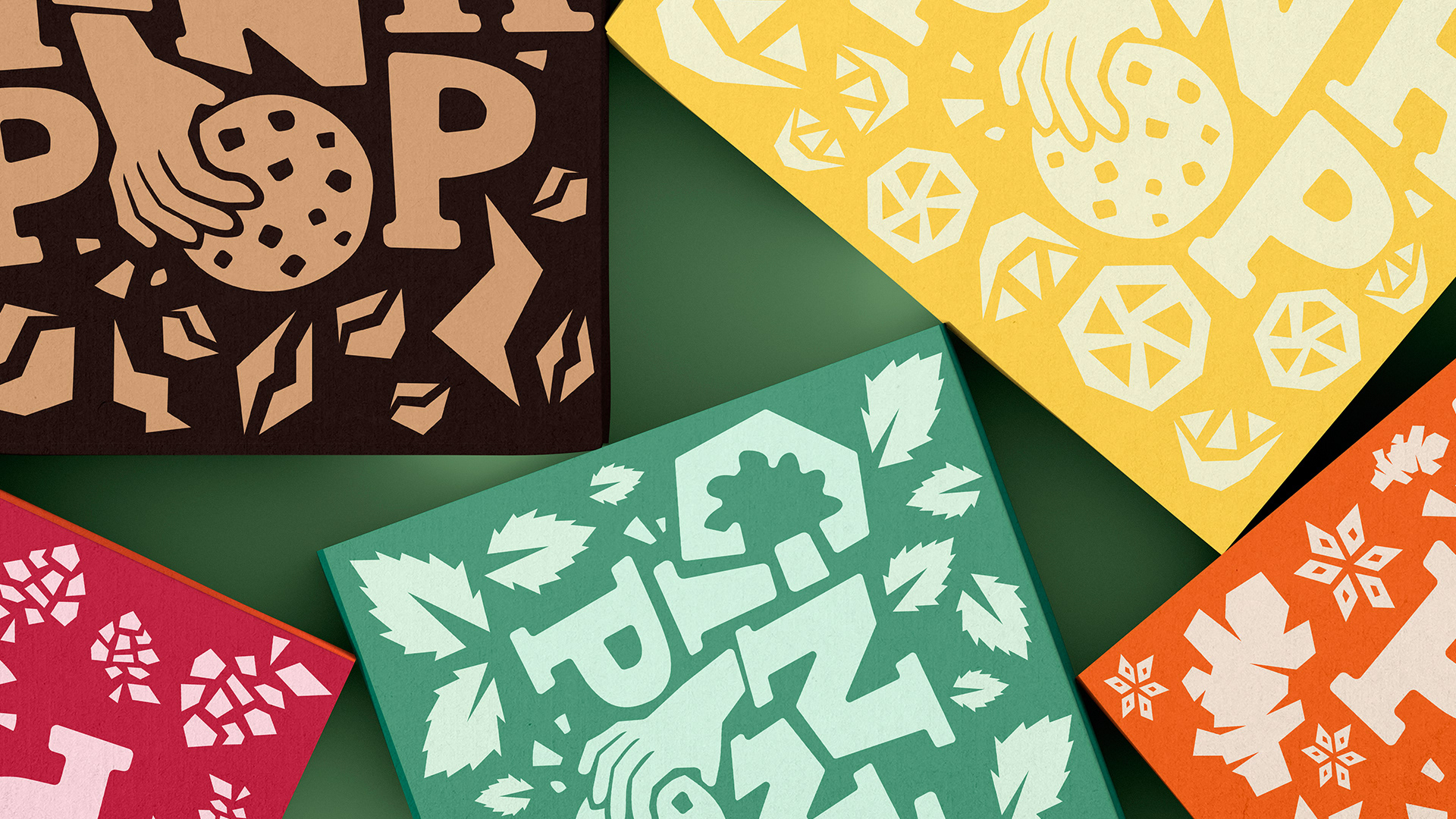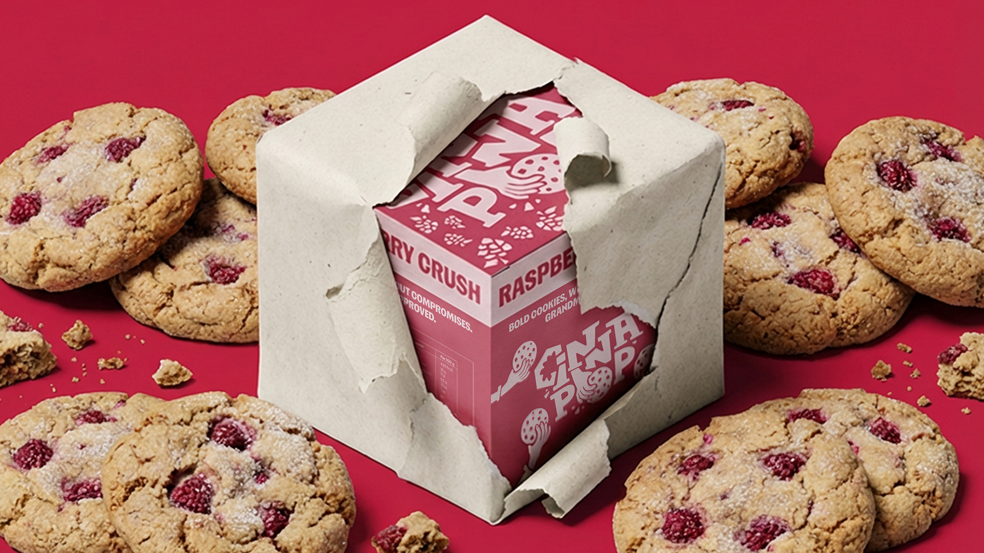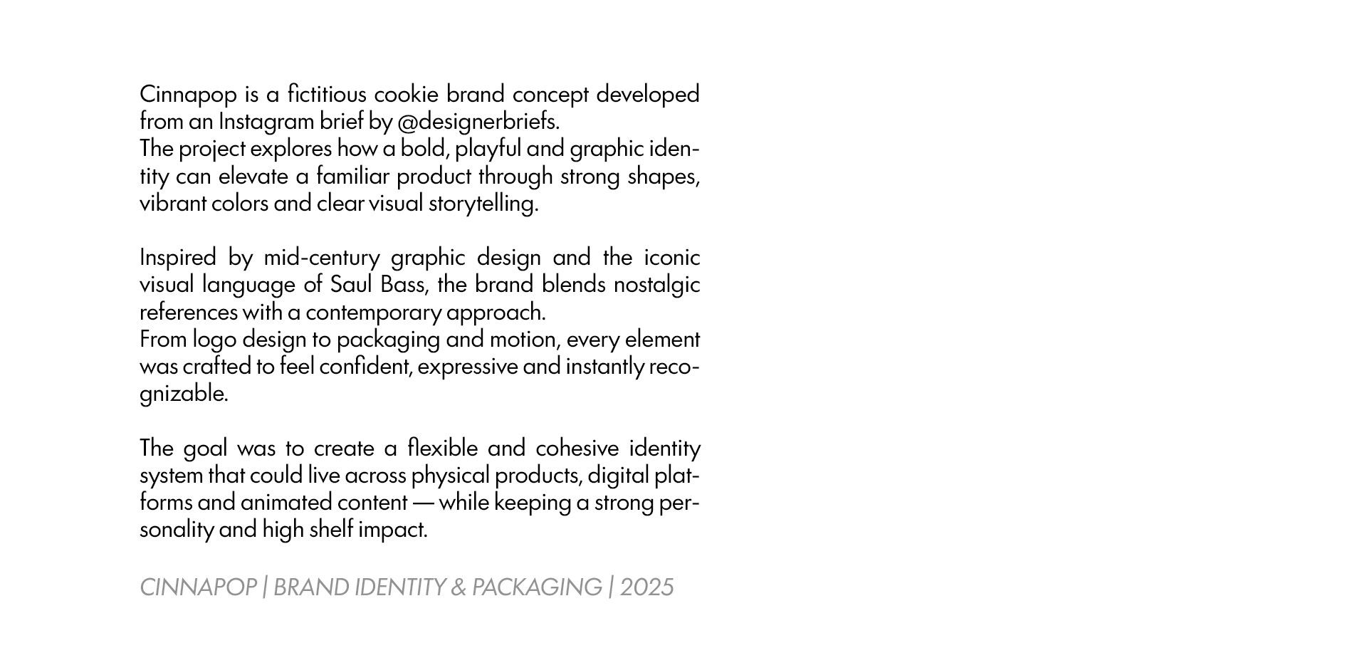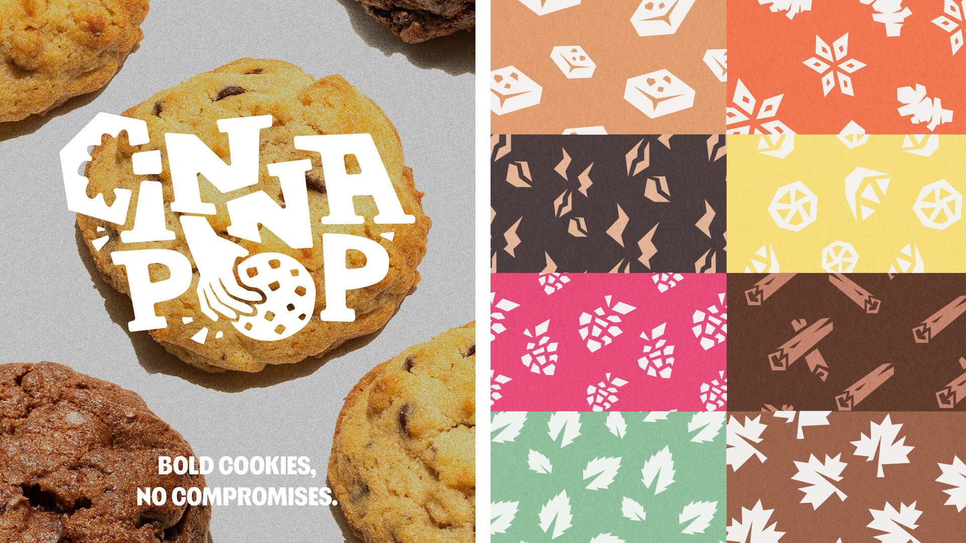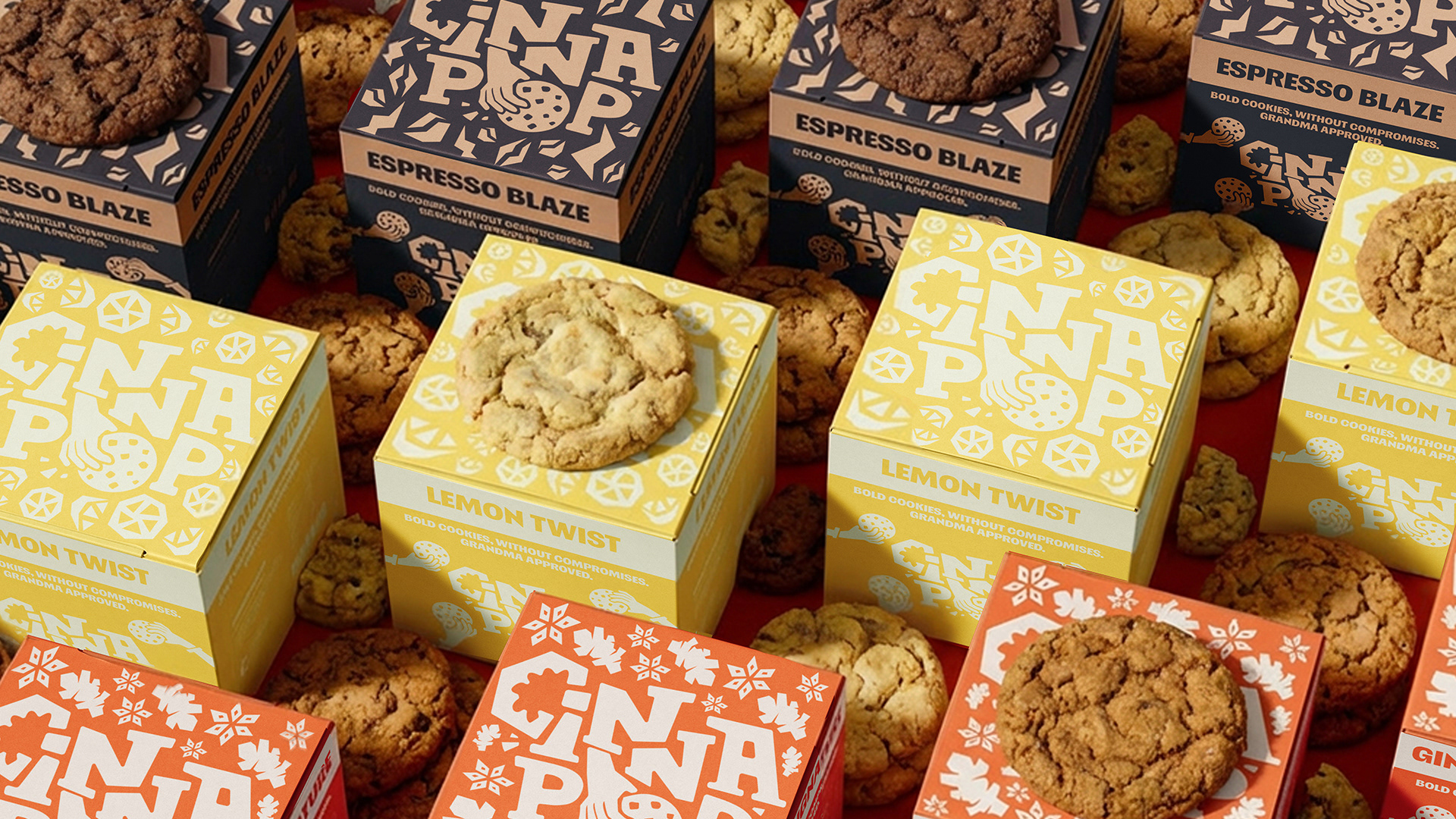 Cinnapop is a fictitious cookie brand concept developed from an Instagram brief by @designerbriefs. The project explores a bold and graphic approach to branding, mixing playful shapes, strong colors and visual storytelling inspired by mid-century design.