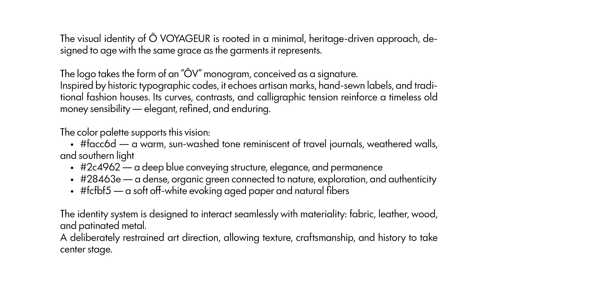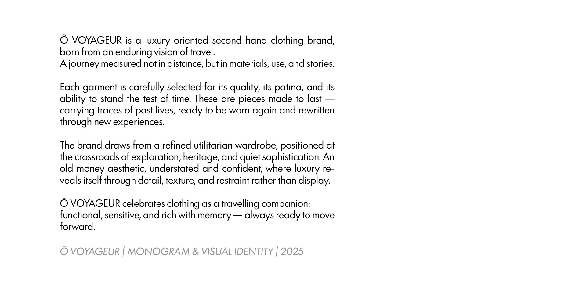 Ô VOYAGEUR is a luxury second-hand clothing brand centered around travel, heritage, and timeless elegance. This project focuses on the creation of the ÔV monogram, designed as a refined, old money signature inspired by artisanal marks and traditional fashion houses. A restrained visual foundation meant to age gracefully, just like the garments it represents.